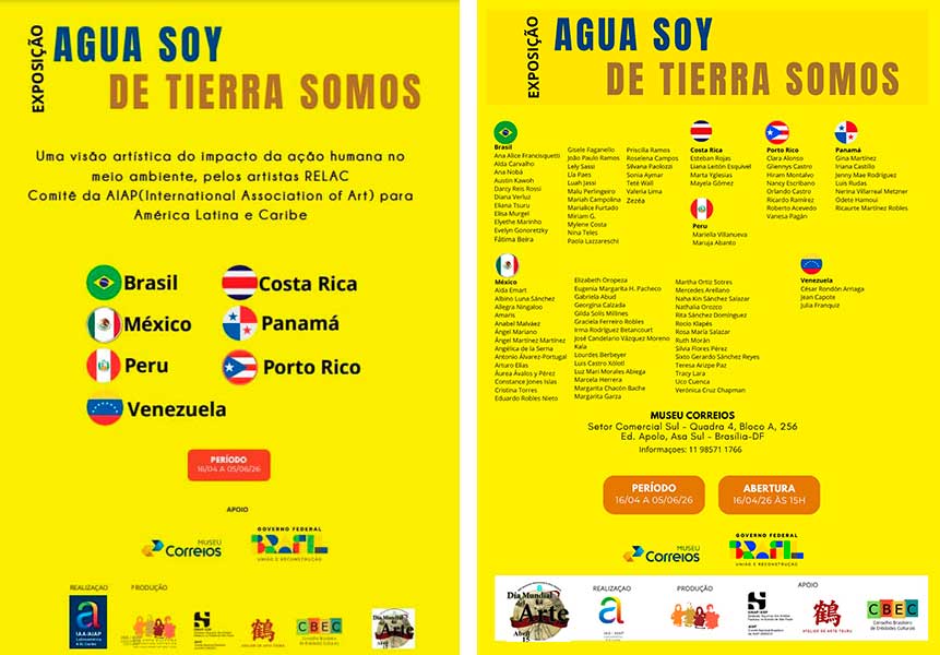 A capital federal torna-se o epicentro do diálogo ambiental na América Latina com mostra itinerante que reúne mais de 100 obras de artistas de nove países. Até o dia 20 de abril, o Museu Correios, em Brasília, abriga uma das exposições mais significativas do circuito contemporâneo latino-americano: “Agua Soy, de Tierra Somos”. O projeto, idealizado pela RELAC (Rede Latino-Americana de Cultura) em parceria com a rede AIAP UNESCO, chega ao Brasil após uma temporada de sucesso no México, consolidando-se como um movimento artístico em defesa do planeta. Arte como Manifesto…